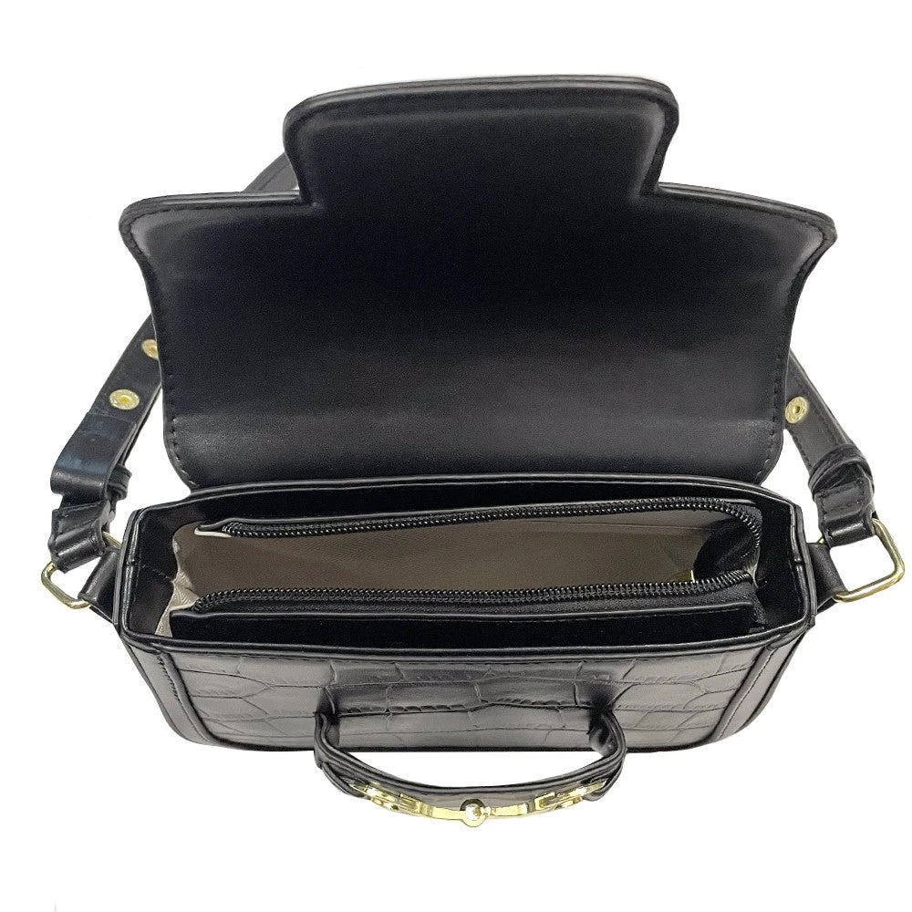 Designer-look, with classic equestrian snaffle bit embellishment. Vegan leather with the look of the real thing. Fold-over top and zippered main compartment with interior accessory pocket. Shoulder strap adjusts from 22-40”.
