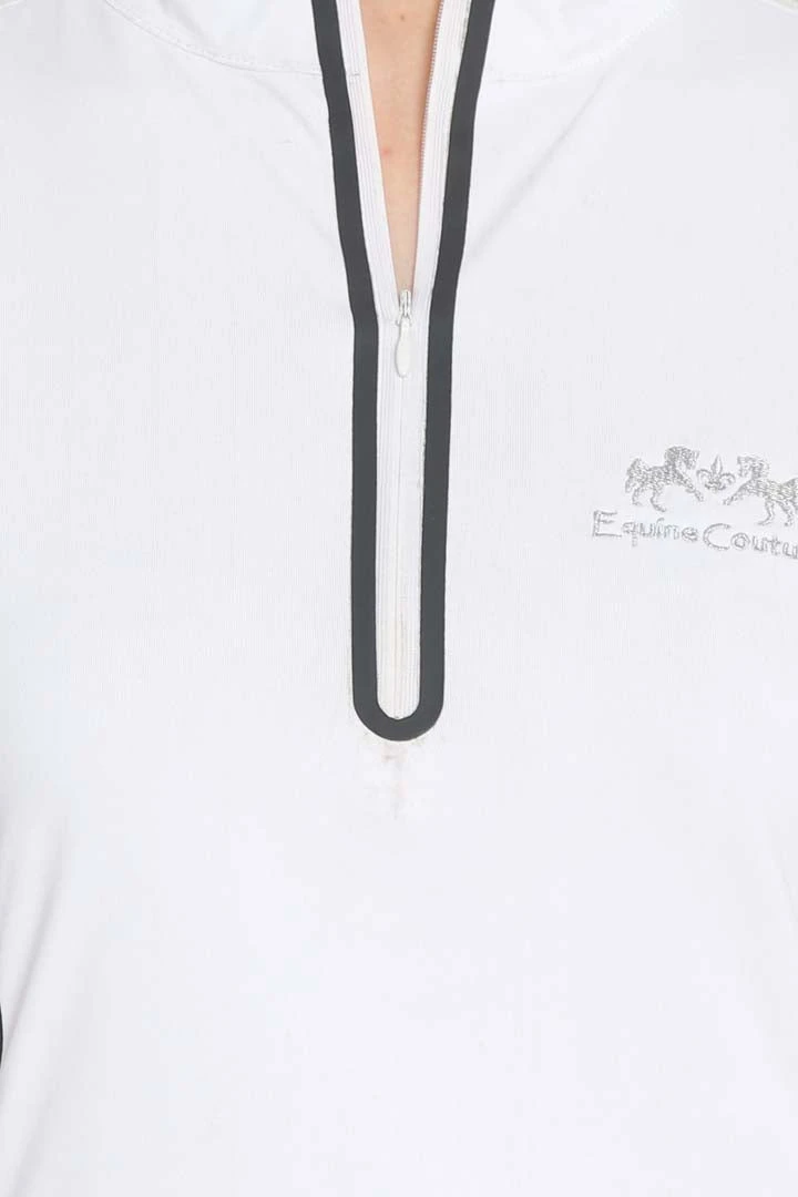 The Equine Couture Ladies Ibiza Sport Shirt offers a simple look to go with any breeches or your favorite pair of barn jeans. Crisp, grey princess lines provide a feminine shape and a sporty aesthetic to your riding outfit. Functional features include a front zipper and mesh on the upper back that provides air flow without losing comfortable stretch. EquiCool fabric technology provides UV protection against the sun’s harmful rays as well as sweat wicking properties to keep you dry all day long. The Ibiza is ideal for schooling or a day of barn work!