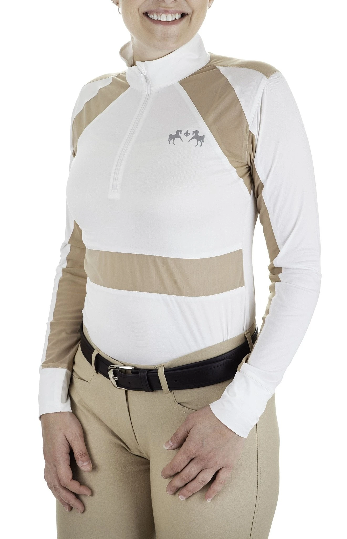 The Equine Couture Nicolette Long Sleeve Show Shirt mixes the classic elements of a show shirt with the airy, fashion-forward color blocks. Available in three different color variations, the Nicolette provides ventilation while maintaining a very striking look. The Nicolette features EquiCool fabric and UV management, making it a versatile garment.