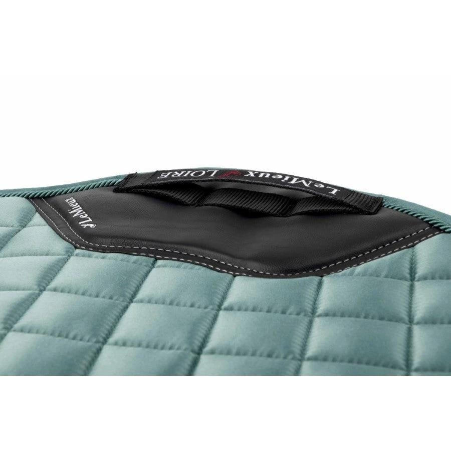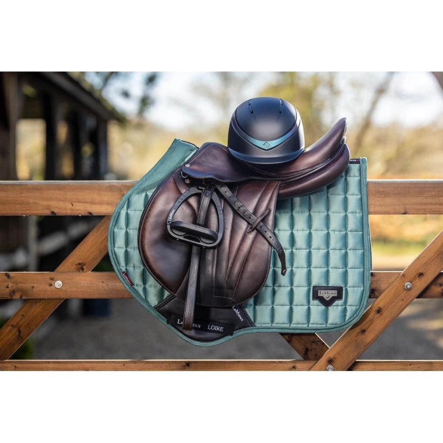 The textured pu leather girth protection area is complimented by an embossed logo and carries the usual signature LeMieux lower girth strap with its inner locking loops. The piece de resistance of the Loire Close Contact Square is its unique metal badge on a leather mount in the lower back corner.